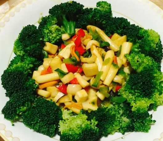 蘑菇4朵、草菇半袋、滑子菇半袋、春筍半袋、荷蘭豆適量、西蘭花1棵、彩椒1個做法: