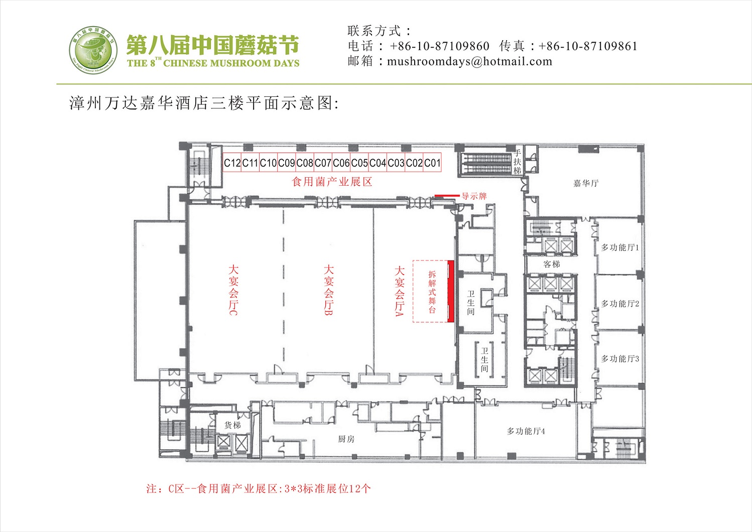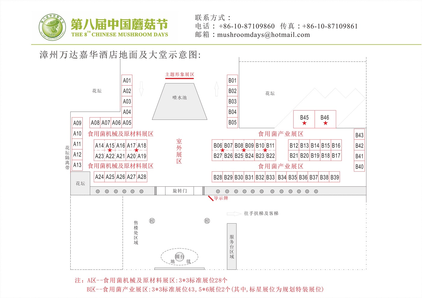 本屆展覽分為室內(nèi)展區(qū)和室外展區(qū),共計(jì)1,500平方米。其中室內(nèi)展區(qū)為萬達(dá)嘉華酒店三樓宴會前廳(正對蘑菇節(jié)論壇主會場出入口),設(shè)置標(biāo)準(zhǔn)展位12個(gè)。室外展區(qū)位于萬達(dá)嘉華酒店室外停車場,設(shè)置標(biāo)準(zhǔn)展位68個(gè),室外展區(qū)均搭設(shè)棚架,使其不受天氣等外界因素影響。