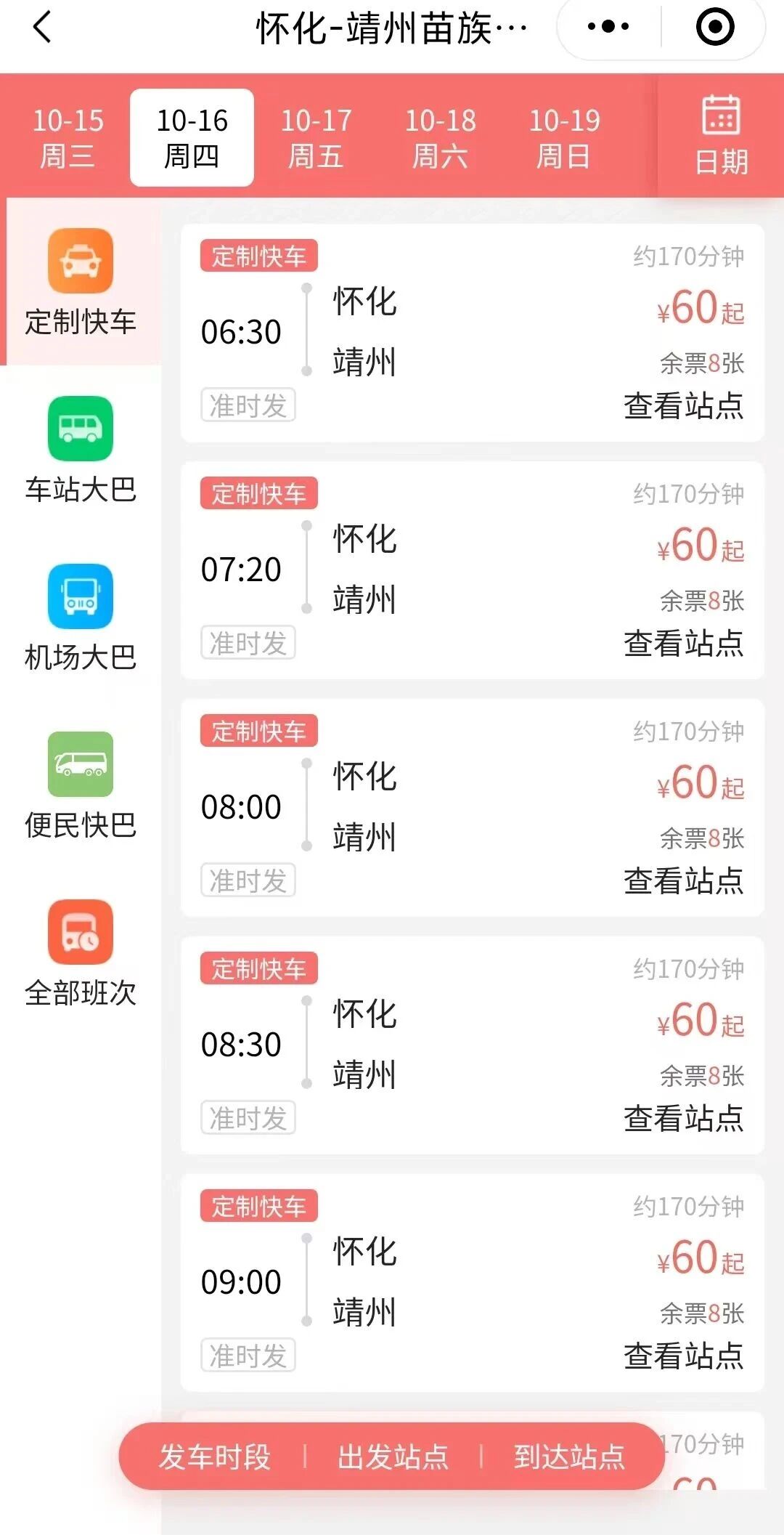 微信搜索懷運集團 大湘之運小程序,進入小程序,選擇出發(fā)站和到達站,點擊查詢車票