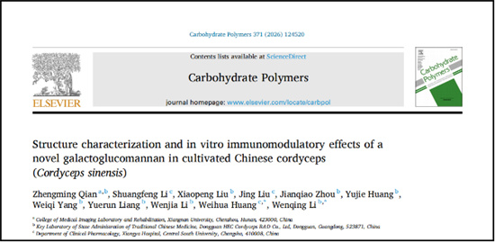 1.Structure characterization and in vitro immunomodulatory effects of a novel galactoglucomannan in cultivated Chinese cordyceps (Cordyceps sinensis)[J]. Carbohydrate Polymers, 2026:124620.