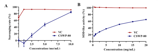 在DPPH自由基清除、SOD超氧化物歧化酶活性測定中,多糖CSWP-80表現(xiàn)出了顯著的抗氧化能力。