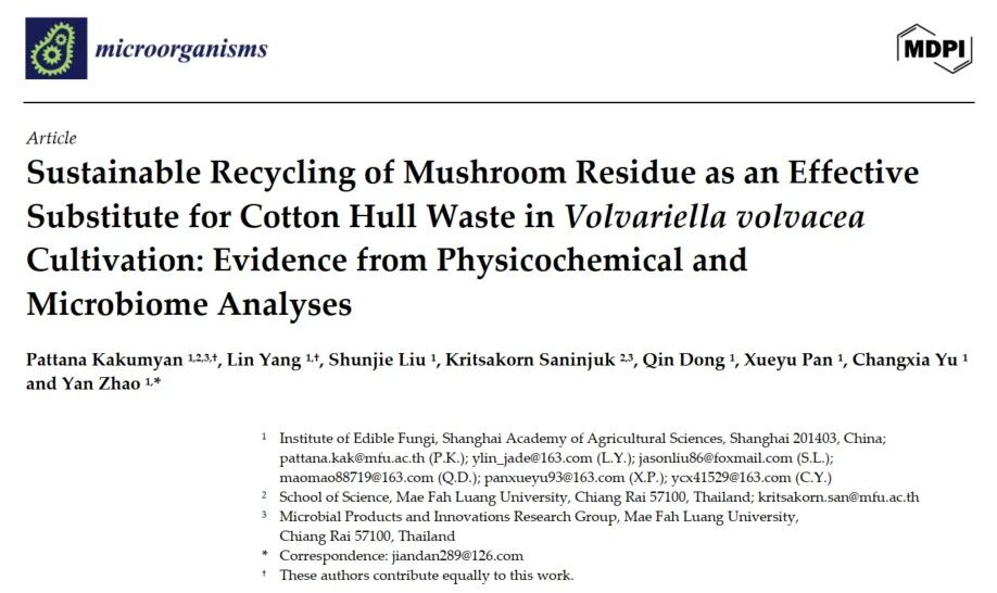 近日,上海市農(nóng)業(yè)科學(xué)院食用菌研究所科技人員聯(lián)合泰國(guó)皇太后大學(xué)研究團(tuán)隊(duì)在Microorganisms(二區(qū),IF=4.2)雜志上發(fā)表題為“Sustainable Recycling of Mushroom Residue as an Effective Substitute for Cotton Hull Waste in Volvariella volvacea Cultivation: Evidence from Physicochemical and Microbiome Analyses”的重要研究。該項(xiàng)工作由上海市科委“一帶一路”國(guó)際合作項(xiàng)目(19390743000)資助,泰國(guó)皇太后大學(xué)Pattana Kakumyan博士,和上海市農(nóng)業(yè)科學(xué)院食用菌所楊琳助理研究員為論文第一作者,食用菌所趙妍研究員為通訊作者,此次發(fā)表的論文是中泰雙方在上海共同開展項(xiàng)目期間取得的又一重要科研成果。