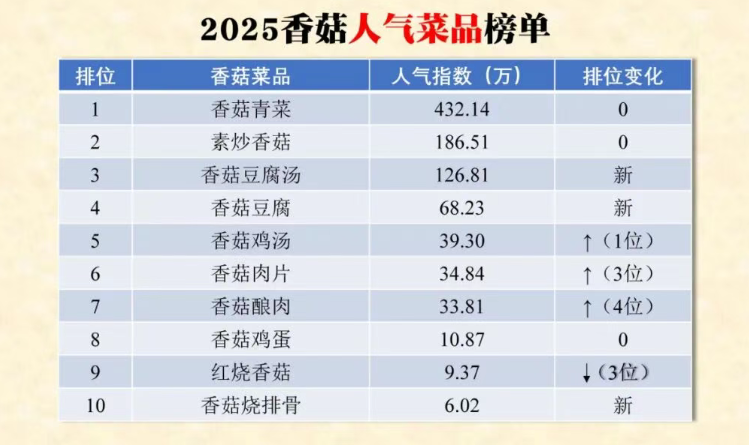誰(shuí)能想到,一道簡(jiǎn)單的 “香菇青菜” 竟成了本次榜單的 “人氣王”!數(shù)據(jù)顯示,這道國(guó)民家常菜以 432.14 萬(wàn)的人氣指數(shù)遙遙領(lǐng)先,遠(yuǎn)超第二名 “素炒香菇”(186.51 萬(wàn))和第三名 “香菇豆腐湯”(126.81 萬(wàn)),用實(shí)力證明 “越家常,越受歡迎”。
