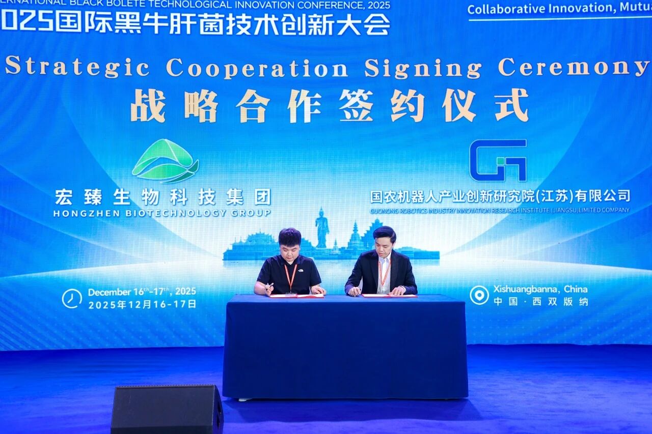 首先,宏臻生物科技集團(tuán)與國農(nóng)機(jī)器人產(chǎn)業(yè)創(chuàng)新研究院(江蘇)有限公司簽署戰(zhàn)略合作協(xié)議。此舉標(biāo)志著黑牛肝菌產(chǎn)業(yè)正式邁向農(nóng)業(yè)科技與智能制造深度融合的新階段。雙方合作旨在通過智能機(jī)器人等先進(jìn)裝備與技術(shù)深度賦能產(chǎn)業(yè),驅(qū)動(dòng)生產(chǎn)模式向智慧化升級(jí)。
